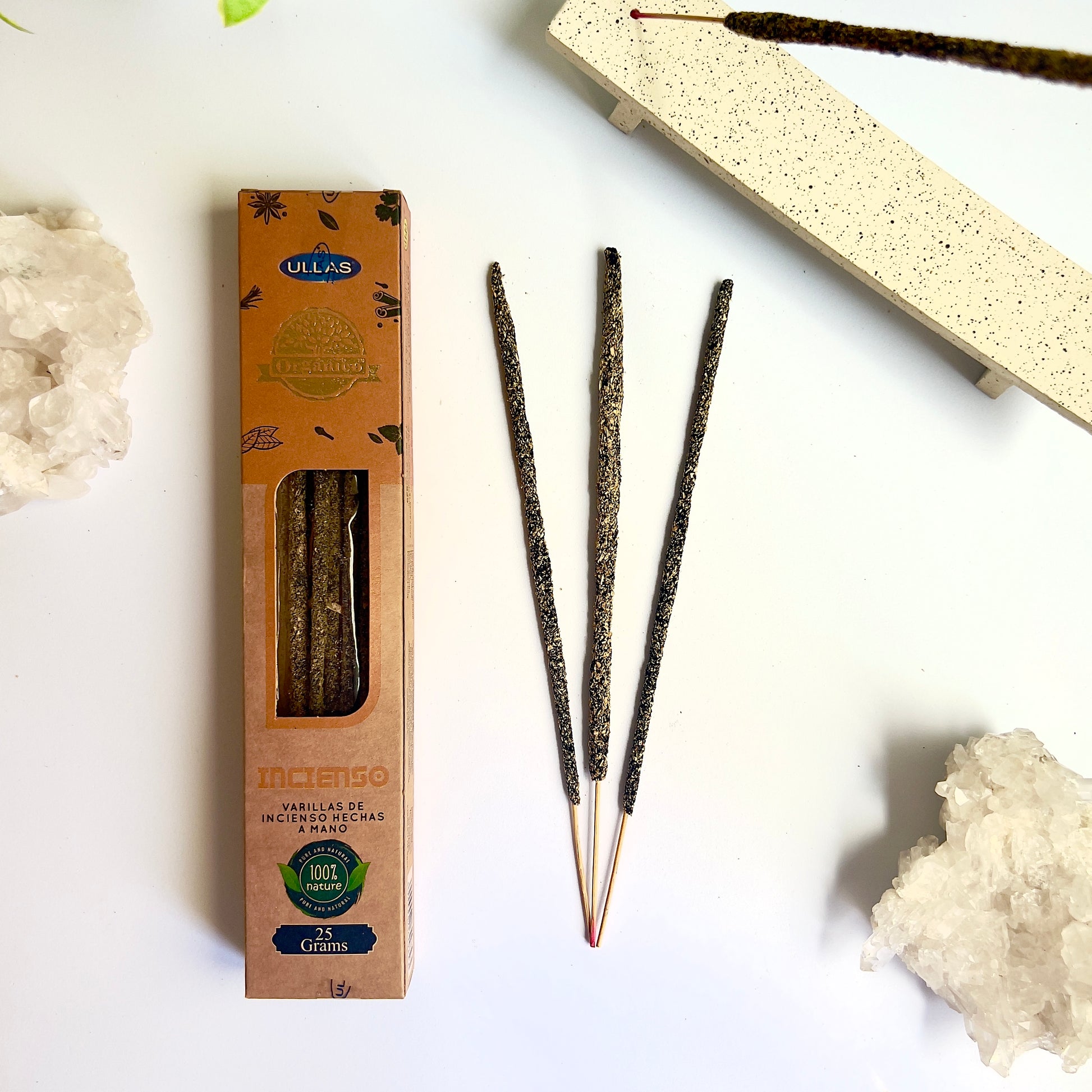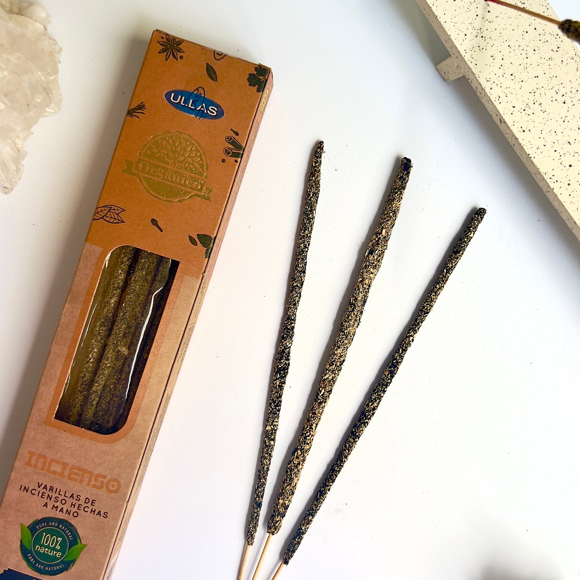 Los inciensos de la marca Ullas están hechos a mano, son 100% naturales y orgánicos. La línea Ullas Orgánico es una nueva gama premium que ha creado esta marca, asegurando haber conseguido inciensos de alta calidad con materiales 100% naturales.